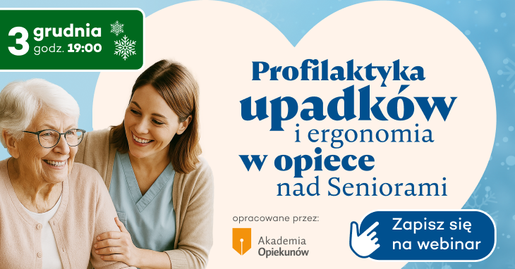 3 grudnia o godzinie 19:00 odbędzie się otwarty webinar dla Opiekunów pod tytułem: "Profilaktyka upadków i ergonomia w opiece - praktyczne wskazówki dla Opiekuna". Na spotkanie online zapraszamy zarówno zawodowych Opiekunów osób starszych, jak i wszystkie osoby na co dzień zaangażowane w opiekę.